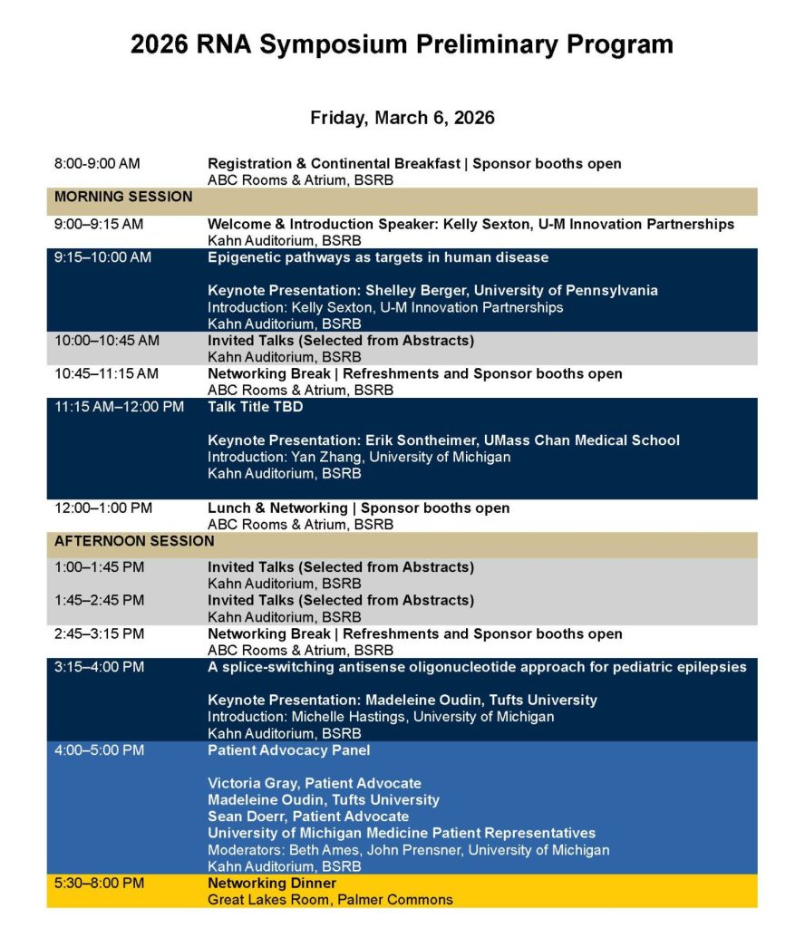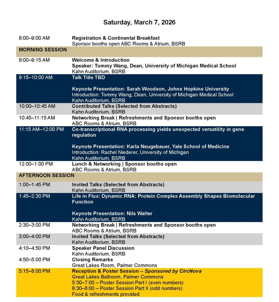 The Center for RNA Biomedicine at the University of Michigan proudly invites you to the 2026 RNA Symposium. Taking place from Friday, March 6 to Saturday, March 7, 2026, this premier event will convene thought leaders and pioneering researchers in the field of RNA science and biomedicine.